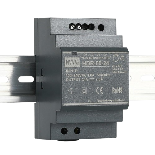 The Mean Well HDR-60-24 is a compact, highly reliable 60W DIN-rail power supply designed for industrial control panels, home automation systems, building management, and instrumentation applications.