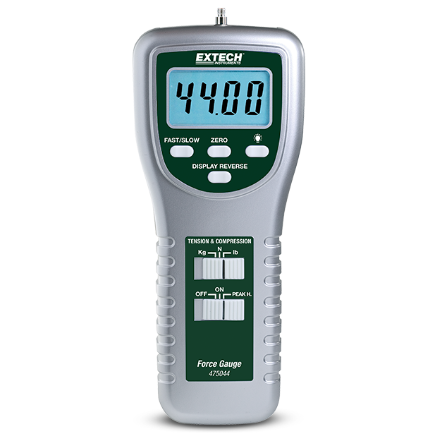 The Extech 475044 is a high-capacity digital force gauge designed for precise measurement of tension and compression forces in industrial, laboratory, and quality-control applications. With its robust 40,000g (40kg / 392N) capacity, high accuracy, and versatile mounting options, the 475044 provides reliable performance for material testing, component evaluation, and mechanical inspection tasks. Its large backlit LCD, peak capture, and fast sampling make it an essential tool for engineers, technicians, and QA professionals.